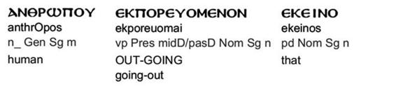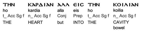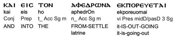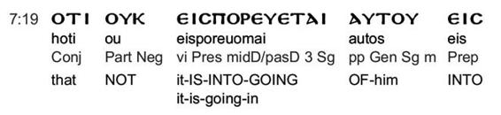 In comparing this old English with more contemporary translations, as demonstrated on the prior page, it becomes apparent that Yeshua’ parenthetical food cleansing claim is completely absent from the King James text. Likewise, a word-for-word interlinear translation33 is more consistent with the King James text, leaving a gaping hole where the New International Version adds the ambitious claim that Yeshua “declared all foods clean.” To illustrate this, the Greek-English interlinear translation34 of Mark 7:19-20 is provided below.