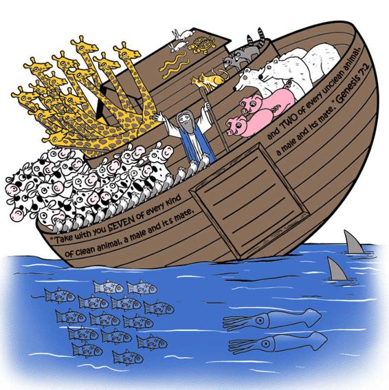 Unfortunately for Noah, his logistical problems were multiplied in accordance with the number and types of animals that entered the ark. Contrary to popular Noachian cartoons and Sunday school projects that show animals trotting up the gangway in simple pairs, along with a few miscellaneous bird varieties perched on the rail or circling above the vessel, not all of the animal kinds boarded Noah’s ark in sets of two. The Bible account tells a drastically different story; Noah brought both clean animals and birds aboard the ark in greater numbers, according to Genesis chapter 7. Unlike the unclean animals, which were admitted only in single pairs, the clean animals and birds were brought aboard in pairs of seven! Genesis is so literal in these details that even seven-year-old children should be able to understand it if they are invited to read the text for themselves. Even contemporary English translations of Genesis make unapologetic distinctions between the required numbers of clean and unclean animals.