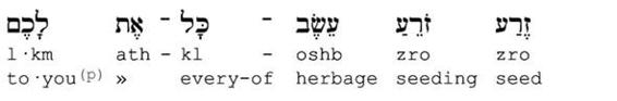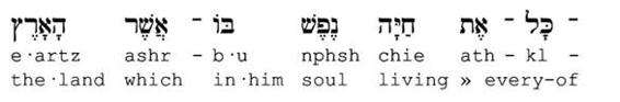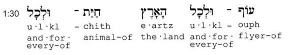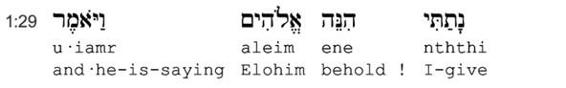 And Elohim says, behold, I have given to you each plant generating seed which is on the face of the whole earth and each tree which in its tree fruit generates seed—for you it is existing for food; and for each animal of the earth, and for each bird of the heavens, and for each moving animal on the earth—which in him there is a soul sustained by all green plants—for your food it is therefore existing. (Gen. 1:29-30 Author’s Translation)