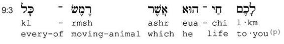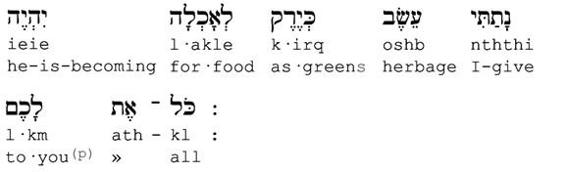 Strangely enough, to resolve all the inconsistencies arising from vegan animal kingdom views of Genesis 1 is to also resolve the open questions emerging from Noah’s confusing omnivore diet blessing in Genesis 9; the exact same error confounding the translation of Noah’s dietary blessing is repeated in the case of Adam’s dietary blessing. In comparing the Hebrew text below to traditional English versions, it is clear that the translators generously “gave” or interjected an extra and presumptuous “I give” (