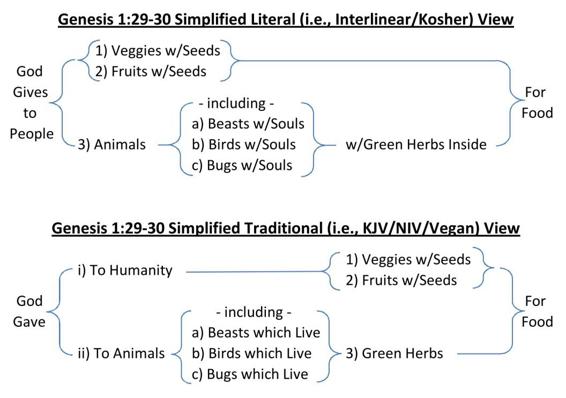 As introduced in pages prior, there are numerous logical problems, like those of audience, dominion, instinct, chronology, and language, which inherently undermine the traditional “vegan blessing” views. In Genesis 1, Elohim spoke a blessing to humanity, declaring human dominion over animals, having created them hungry and with instincts and appetites the day before the blessing was uttered. Elohim spoke deliberately and coherently, to a species created with ears to hear, with an intellect capable of processing complex language, and the memory to retain the instructions; and Elohim spoke each word for a human purpose. Being an omniscient being, it only stands to reason that Elohim would put forth rational instructions to rational creatures; he did not create creatures with “dead souls”, and did not need to limit the green food to animals with “living souls” when it is impossible for “dead souls” to eat. Likewise, Elohim would hardly declare human food in the future tense saying “it will be for food”, while speaking of animal food in the past tense, saying, “for food it was so” to an animal audience of limited cognitive potential for the sake of posterity.