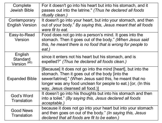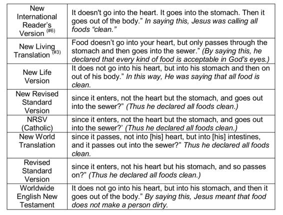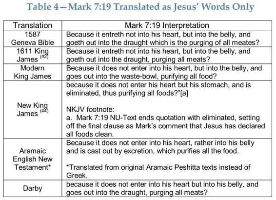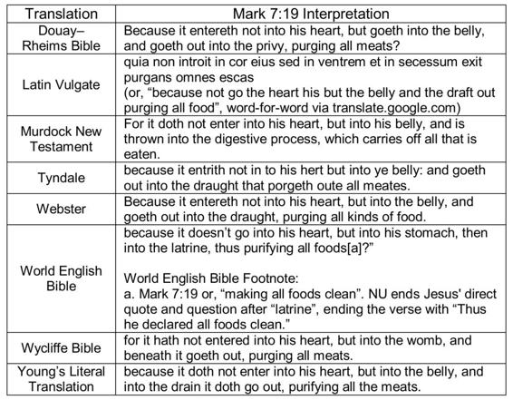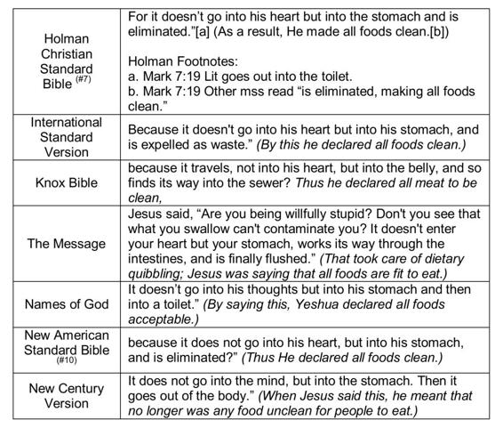 In response to these questions, English renderings of Mark 7:19 from over forty of the most popular and respected Bible translations182 have been included in tables below for purposes of comparison and consideration. Apart from obvious dispensational biases and overtones, it would appear that differences in translation are defined by the following variances: