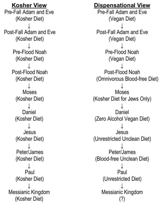 Figure 2 below illustrates and compares the kosher views to the dispensations assumed by proponents of unkosher views, in order to demonstrate the unreliability of dispensational dining doctrines. Fickle dispensational tendencies are made evident in many translations and traditional interpretations.
