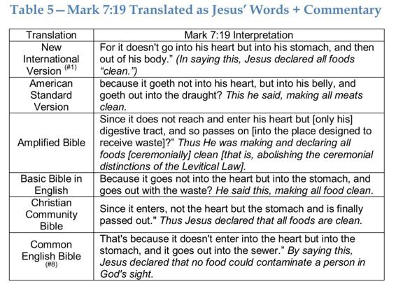 Moreover, as Table 5 translations populate the conclusion of Mark 7:19 with superfluous verbs, subjects, objects, and adjectives, the texts begin to assume a host of different meanings. Rather than having the digestive tract as the subject performing a function like “cleansing” or “purging,” as the lone Greek καθαρίζω (katharizō)184 action verb should imply, many Table 5 translations transform the verb into an adjective, adding it to the end of the verse, and using it to describe the “food” subsequent to the digestion. Also, in place of the “cleansing” verb, most of the Table 5 translations insert the verb “declared” or “made” in its place, along with “Yeshua” as the subject of conversation. Even though “Yeshua declared” does not appear in the original Greek, these two words are nevertheless routinely added within these creative Table 5 interpretations and translations, implying that Mark was invoking Yeshua’ authority or power to redefine or transform all foods to be “clean,” as he commented on Yeshua’ earlier words—supposedly clarifying what Yeshua really intended to convey.