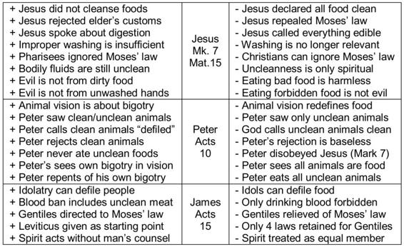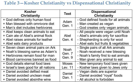 To help illustrate how presumptive dispensational misinterpretations have produced mistranslations, which in turn have contributed to even greater misinterpretations, Table 3 below includes a summary of points discussed in earlier chapters, contrasting true forms (+) of kosher Christianity against false (-) dispensational food related doctrines. Although Table 3 does not differentiate between errors of interpretation and errors of translation, the summary of accounts below will nevertheless help illustrate how just a few minor and unkosher mistranslations, like those of Genesis 1 and Mark 7, can influence the interpretation and thought progression throughout the entire Bible narrative.