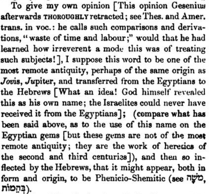 “ To give my own opinion, I suppose this word [Yahweh] to be one of the most remote antiquity, perhaps of the same origin as Jovis, Jupiter, and transferred from the Egyptians to the Hebrews.” Gesenius’ Hebrew Chaldee Lexicon Old Testament Scriptures, translated by Tragelles, 1857, page 337 .