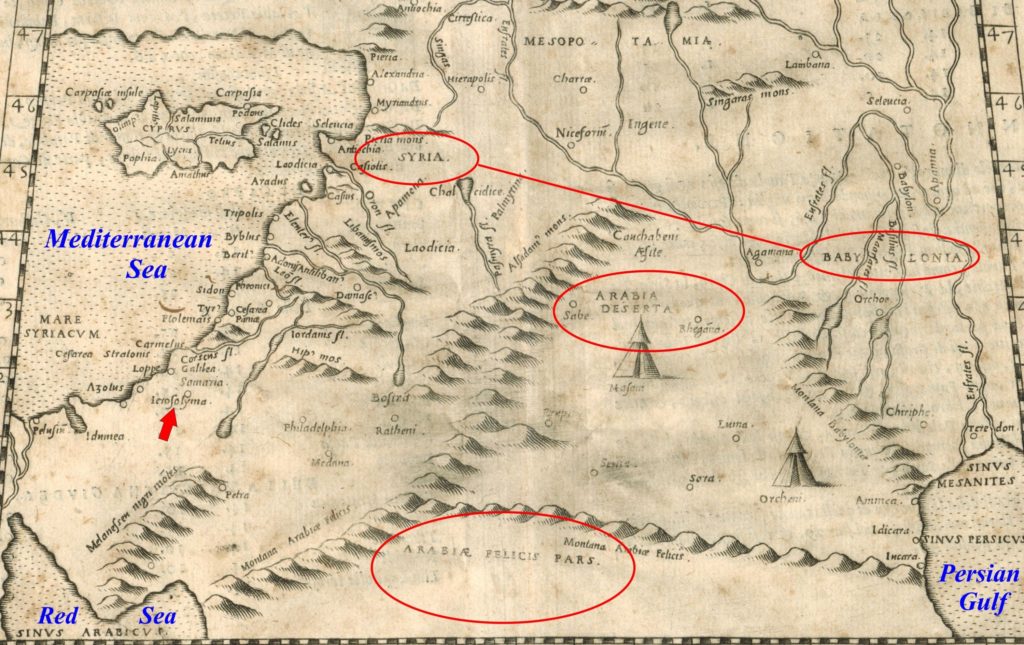 Figure 1. A Map Based on Ptolemy Showing Northern Arabia . Strabo stated that "the whole of Arabia" lay south of a line between Syria and Babylonia ( drawn in red ). Arabia Felix was still farther south, bounded by the Persian and Arabian Gulfs. Arabia Deserta is shown below the Syria-Babylonia line. The future "Sinai Peninsula" is shown directly south of Jerusalem (arrow), but it should be placed farther west. No Arabia Petraea region is shown. From Ziletti 1574, Venice. (author's collection)