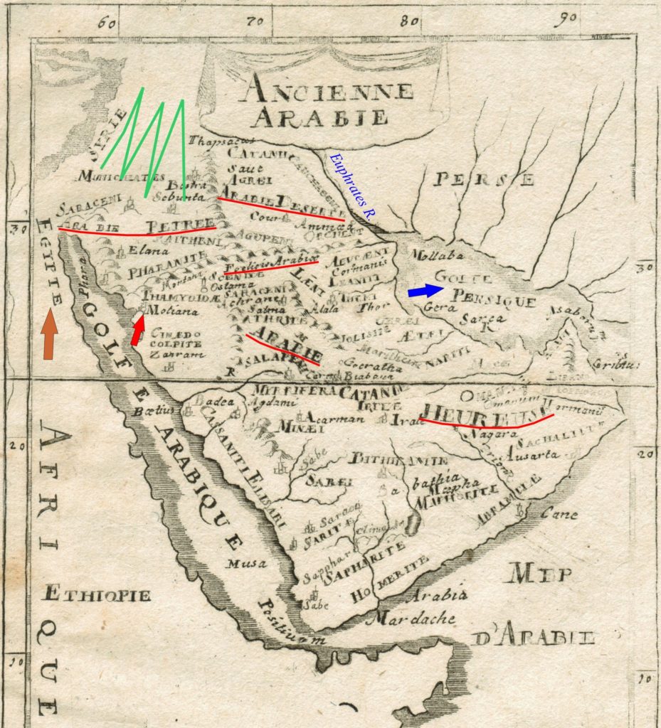 Figure 2 Circa 1719 Map of ArabiaArabia Deserta lay between Syria (green) and the Euphrates River. "Foelicia" Arabia ( Arabia Felix ) or "Arabie Heureuse " (French: happy), occupied the Arabian Peninsula. "Arabie Petree," sandwiched between southern Syria (Judea) and Arabia Felix , is shown extending west to Egypt (brown arrow). "Motiana" (red arrow) is Ptolemy's Modiana , a part of Midian (Section 4.2). (from Allain Manesson-Mallet 1719, author's collection)